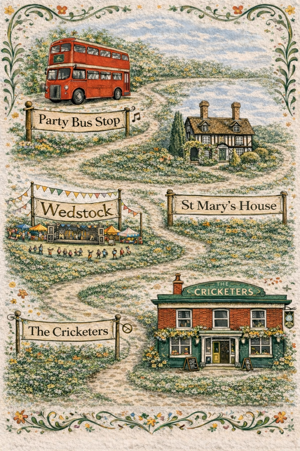 Mingle and board the big red party bus to Bramber Village (journey time around 15 minutes).